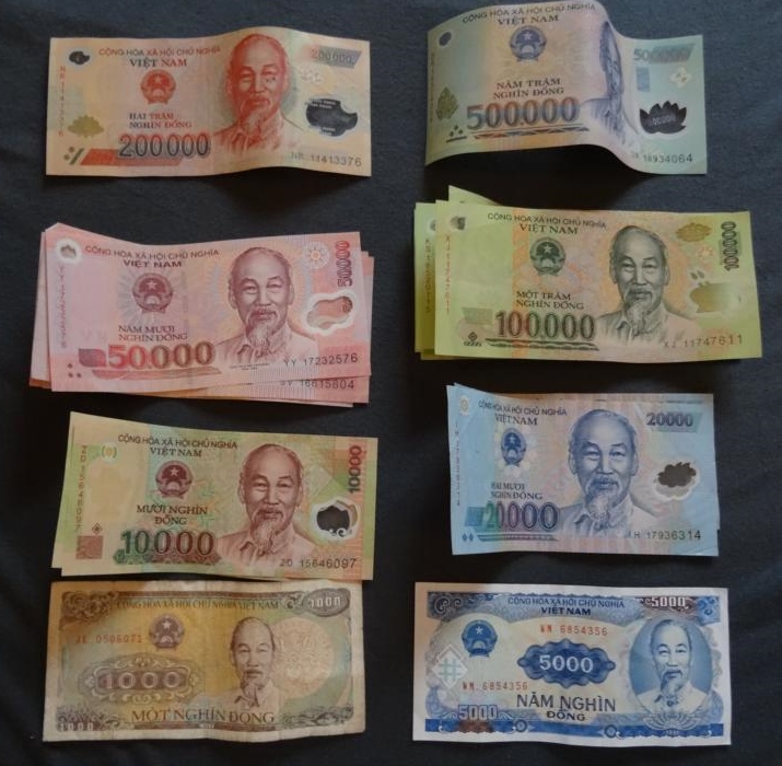 Auf allen Geldscheinen ist er auch drauf. Münzen gibt es hier nicht. Auf der Rückseite sind berühmte Bauwerke/Tempel in Vietnam zu sehen.