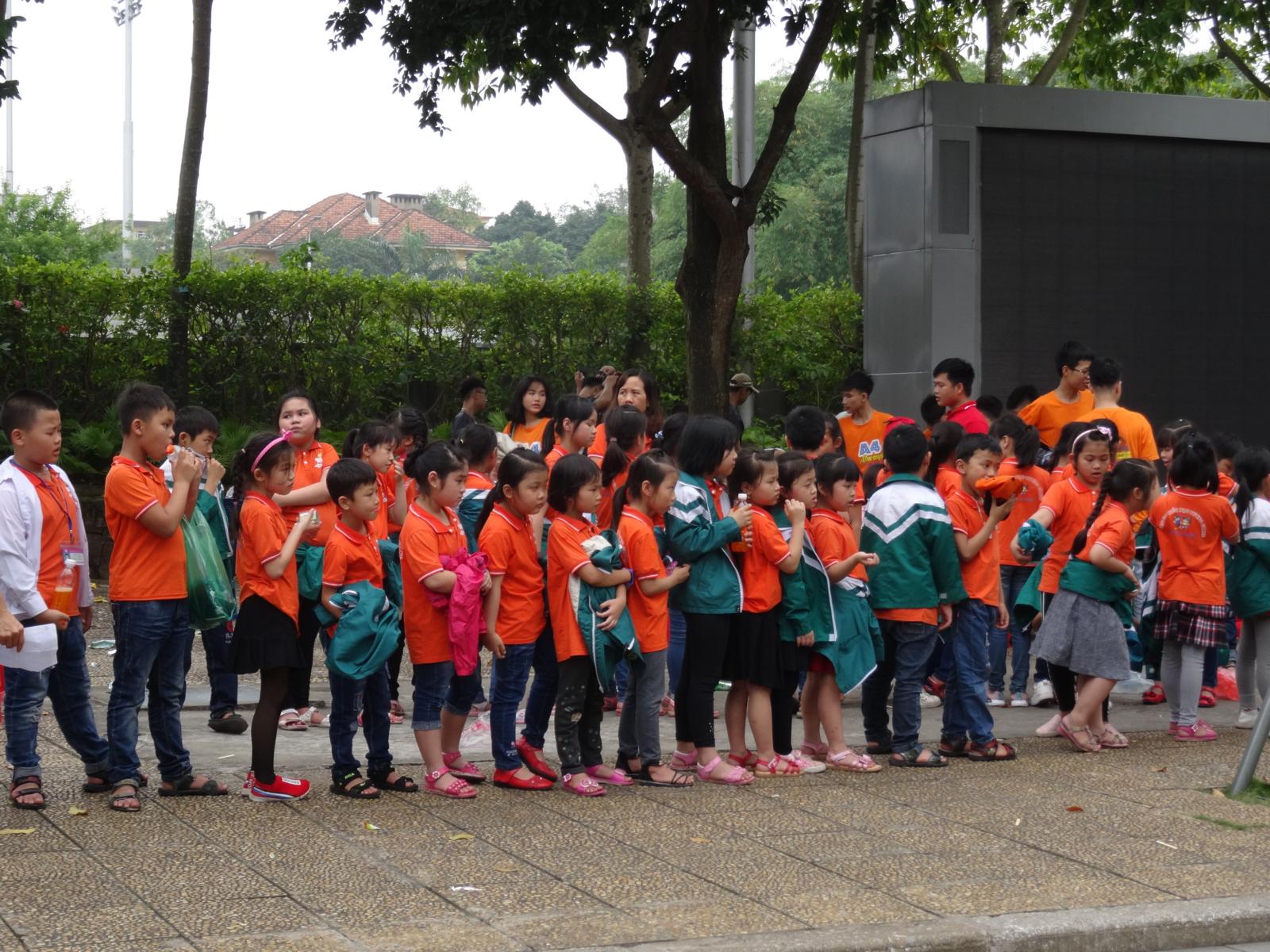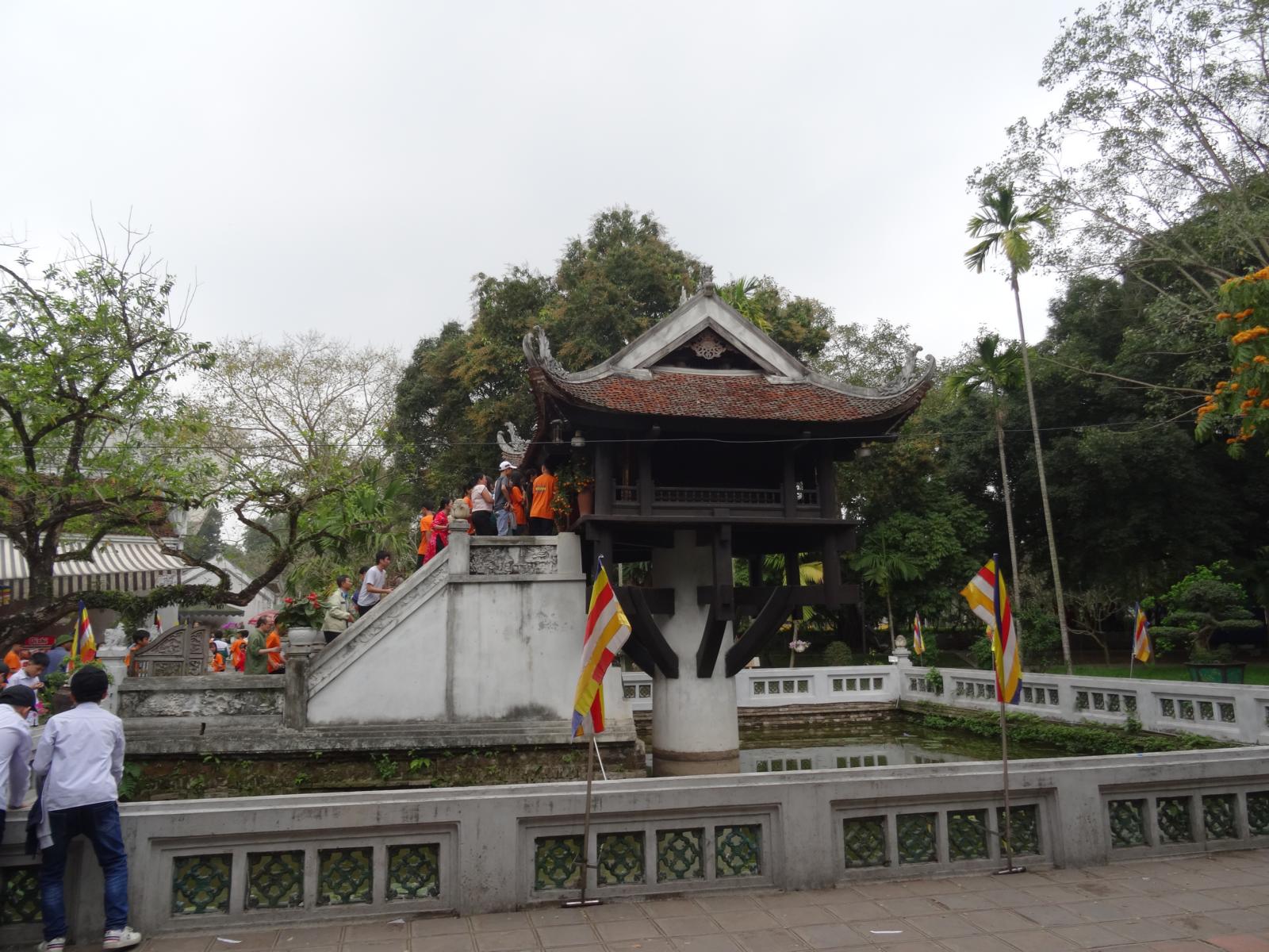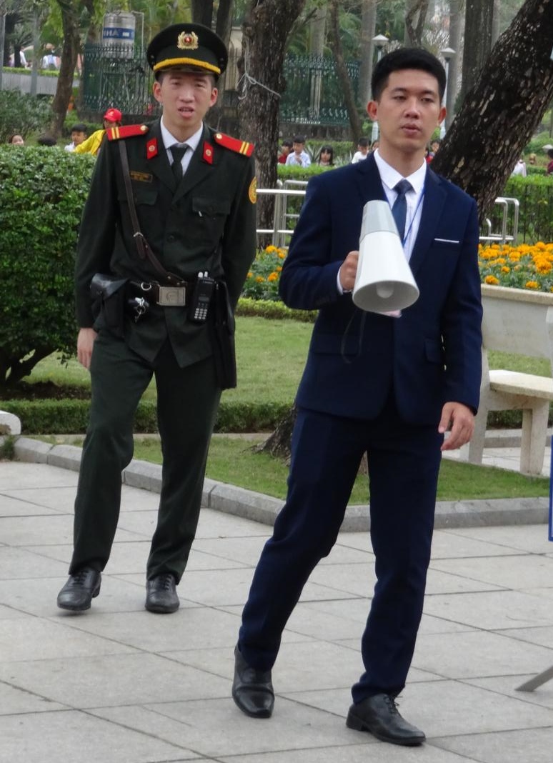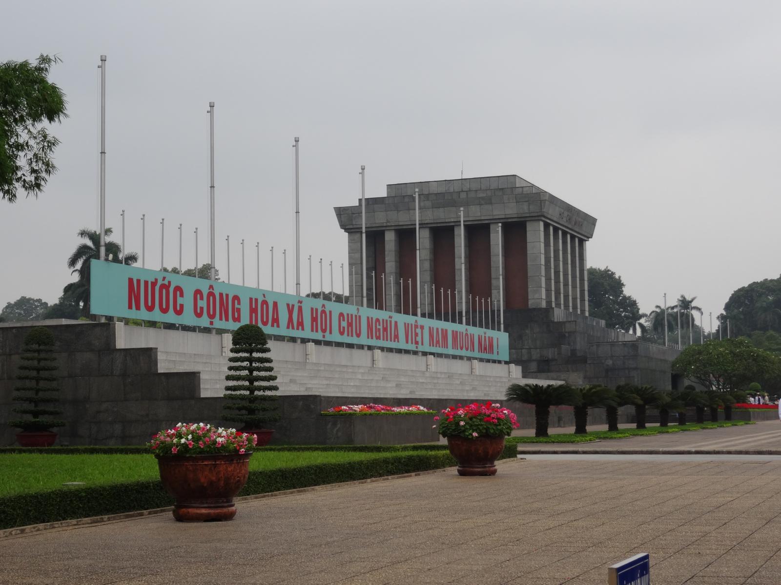 Ho Chi Minh ist und bleibt der große Volksheld Vietnams. Sein Mausoleum ist umgeben von einem riesigen Platz (auf den ich nicht drauf gekommen bin, weil ich ständig da und dorthin geleitet wurde) und parkähnlichen Anlagen. Ruhig ist es trotzdem nicht, da dies bestimmt der am meisten besuchte Ort in Vietnam ist, jedenfalls von den Vietnamesen. Der Einlass zur Anlage ist kostenlos, wird aber von Sicherheitsmaßnahmen wie am Flughafen begleitet. Fotografieren ist in vielen Bereichen nicht erlaubt. Endlos scheinende Menschenschlangen warten darauf, an dem aufgebahrten Leichnam vorbeigehen zu dürfen, bzw. schnell daran vorbeigeschoben zu werden. Jede Menge Schulklassen sind auch da.