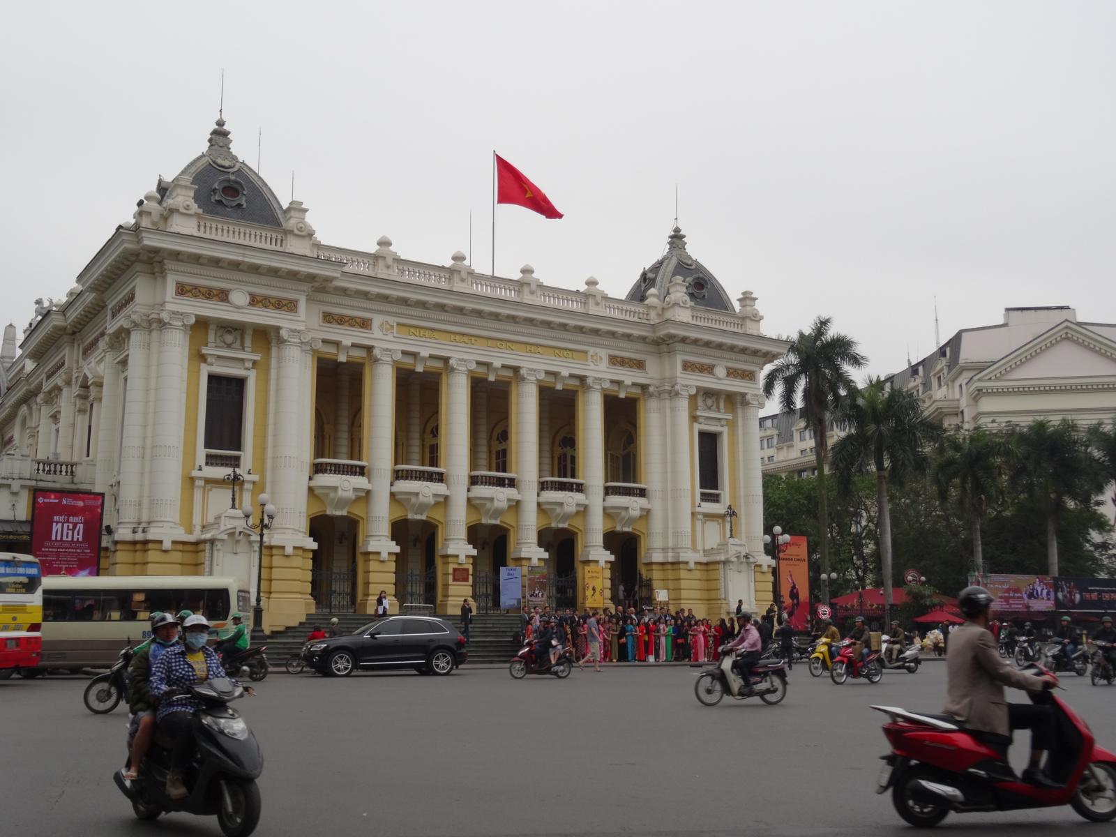 Die Franzosen haben in ihrer Besatzungszeit der Stadt ihren Stempel aufgedrückt und der ist heute noch gut sichtbar. Sie kamen 1883 nach Hanoi, das damal 150.000 Einwohner hatte (heute 7 Mio.), und verpassten der Stadt ein europäisches Flair. Stadtteile wurden zerstört, Seen und Kanäle aufgeschüttet oder verkleinert. Man brauchte Platz für breite, baumgesäumte Alleen und die Oper, Kirchen, öffentliche Bauten und Luxusvillen. Hanoi sollte das Paris Asiens werden. Das endete 1940 mit der Eroberung durch Japan, auch wenn die Verwaltung des Landes bis Anfang 1945 in der Hand der Franzosen blieb. 1945 folgt die Ausrufung der Demokratischen Republik Vietnam (DRV) durch die Provisorische Regierung unter Präsident Ho Chi Minh in Hanoi. Die Franzosen blieben aber und es begann der Indochinakrieg. Soweit die Geschichte bis dahin.