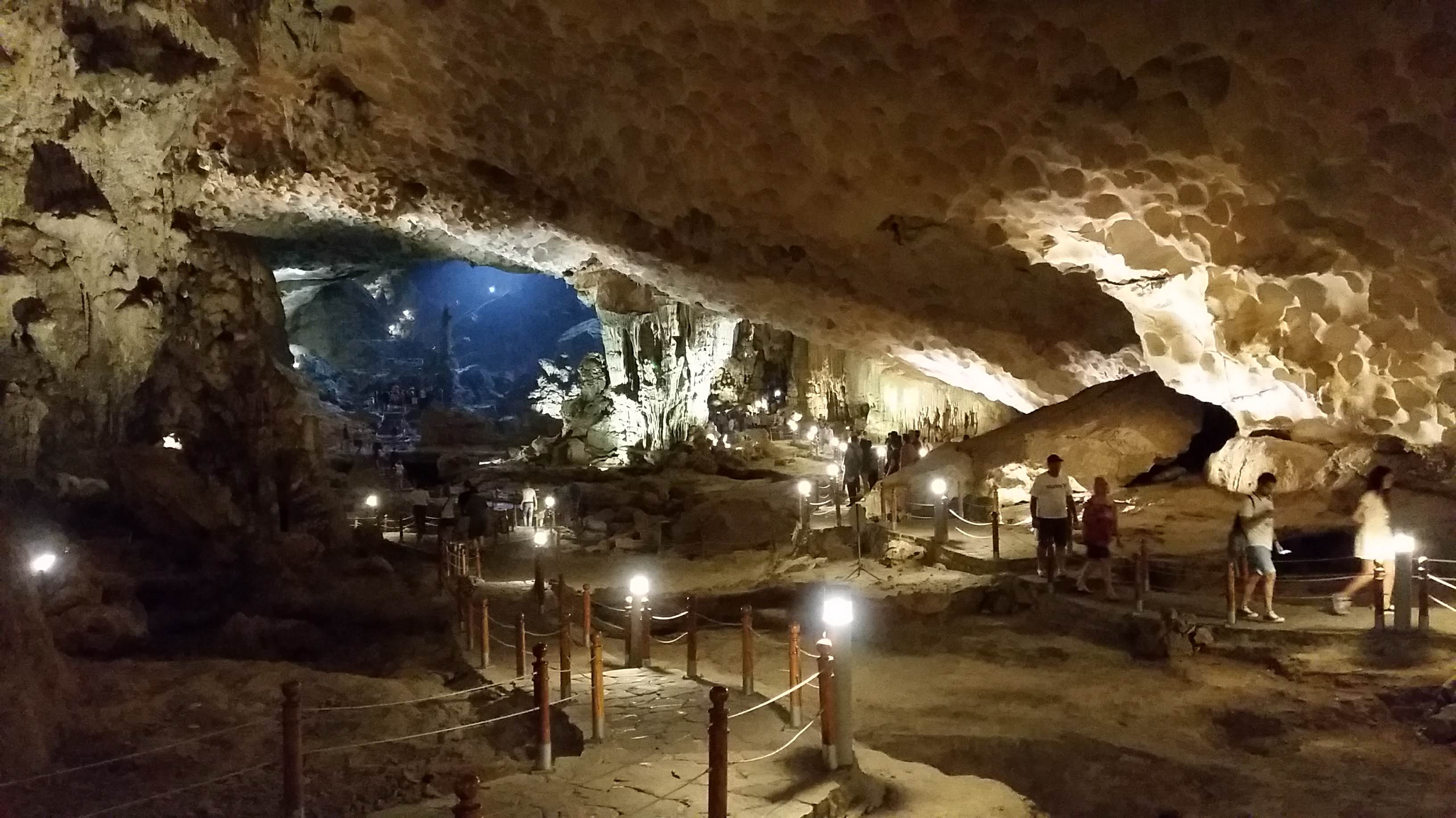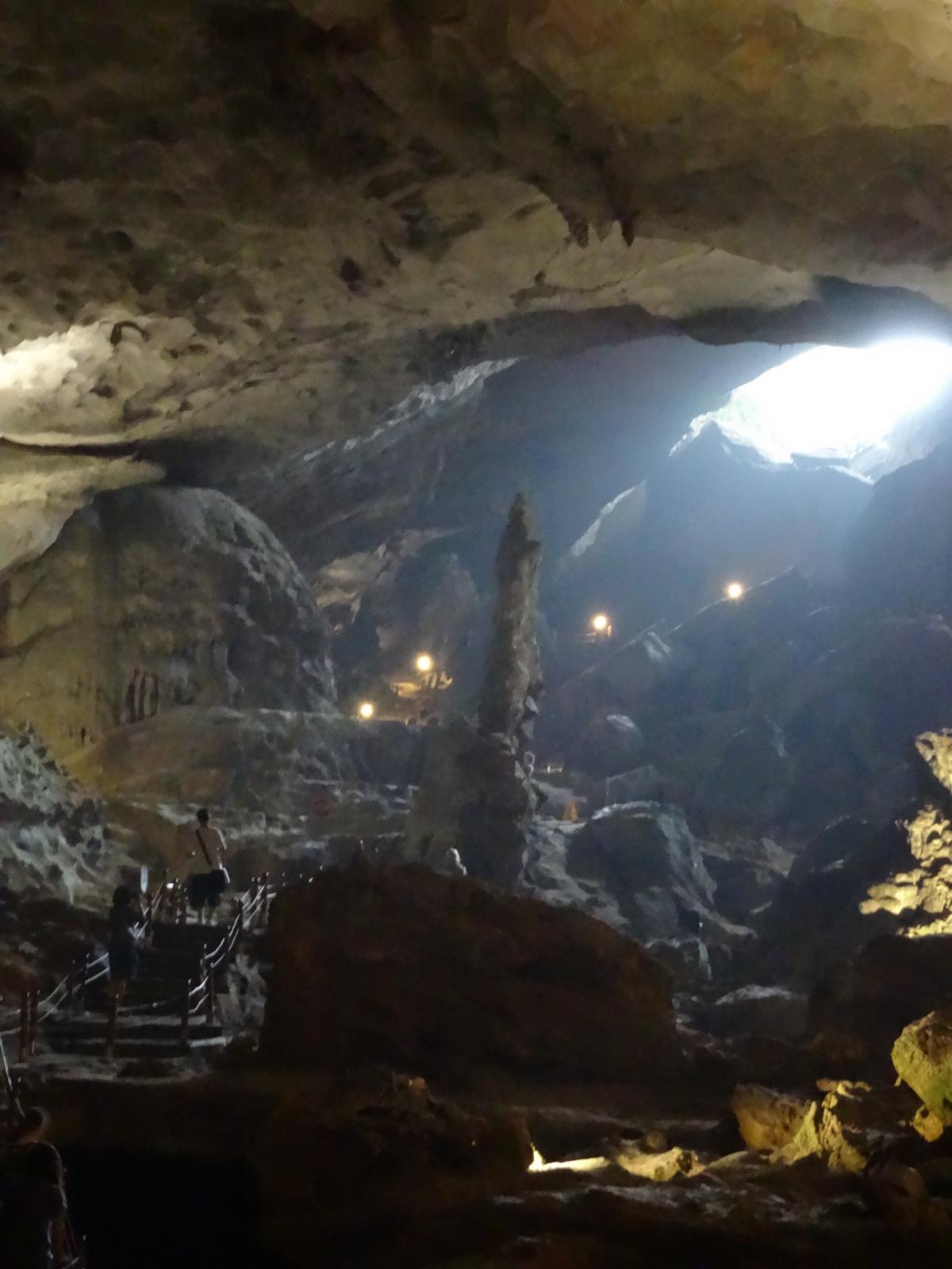 Der Kurzurlaub geht zu Ende. Als letztes geht es in die Hang Sung Sot Höhle (Surprise Cave), in der ich gestern schon mal war. Diesmal ohne Fotoapparat und ganz entspannt. Diese Höhle kann man ruhig zweimal besichtigen. Es scheint mir in Nordvietnam sowieso sehr viele Höhlen zu geben. Dies ist jetzt die fünfte oder sechste, die ich auf meinem Kurztrip sehe, aber die mit Abstand beeindruckendste. Sie besteht aus drei Räumen und wird kunstvoll in Szene gesetzt. Sie gehört zu den Touristen Hotspots in der Halong Bay und ist dementsprechend gut besucht. Und das, obwohl der Anstieg zur Höhle den ein oder anderen ganz schön aus der Puste bringt.