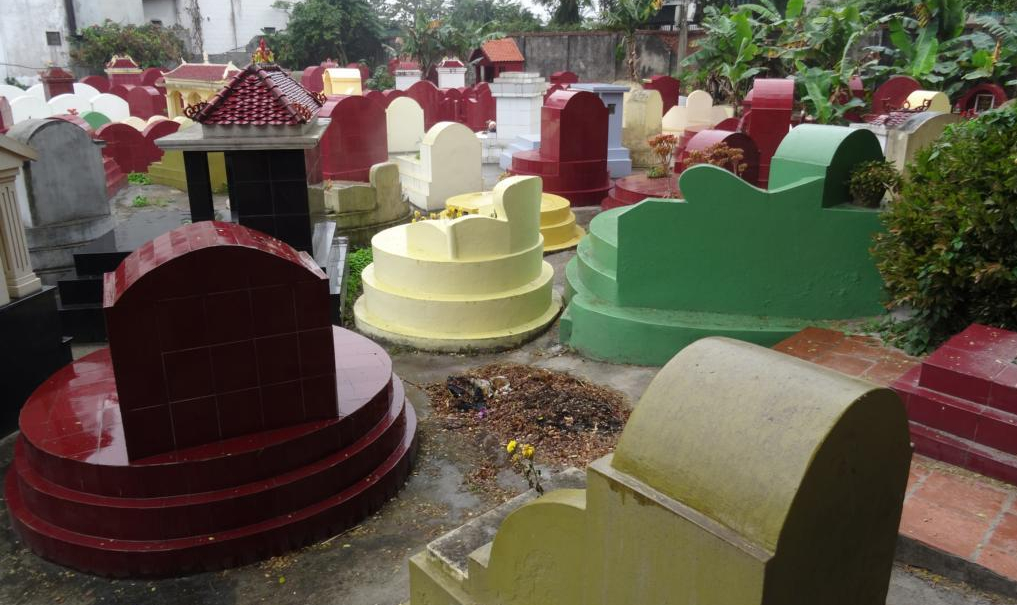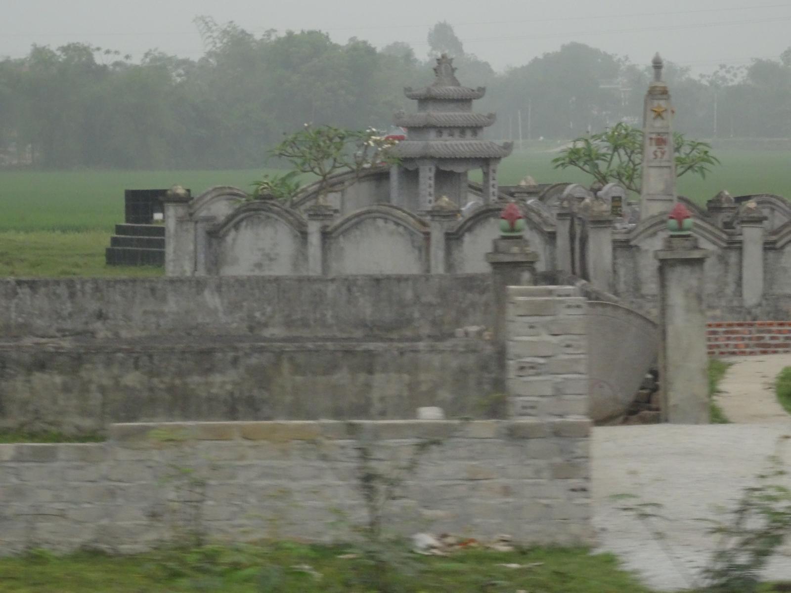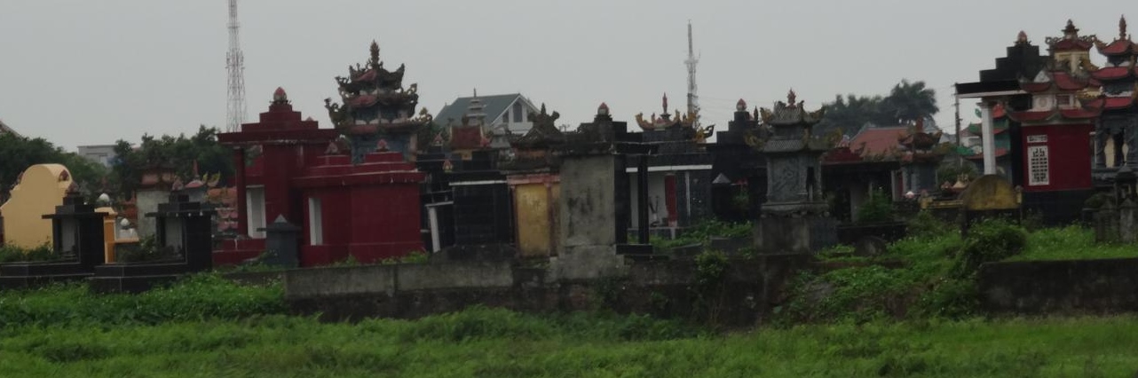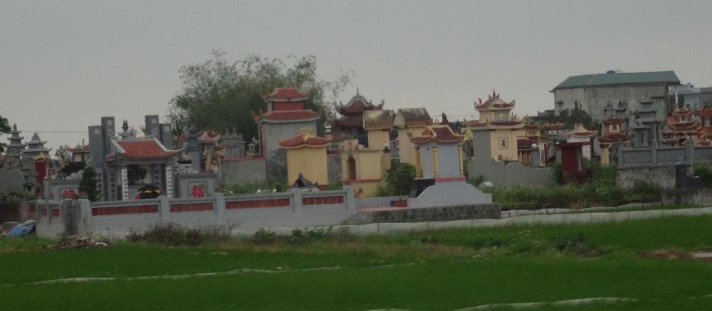 Sobald man die Stadt verlässt, fallen die vielen Friedhöfe auf, die sich am Rand der Reisfelder befinden.