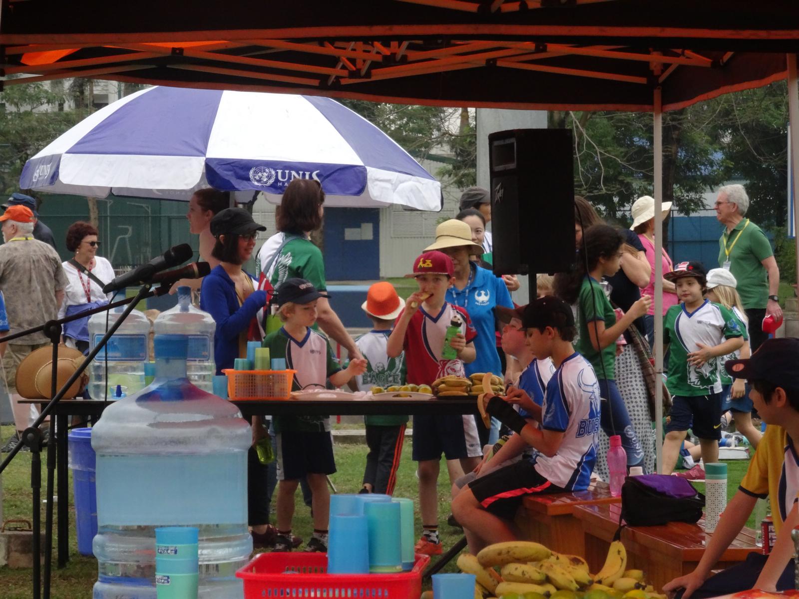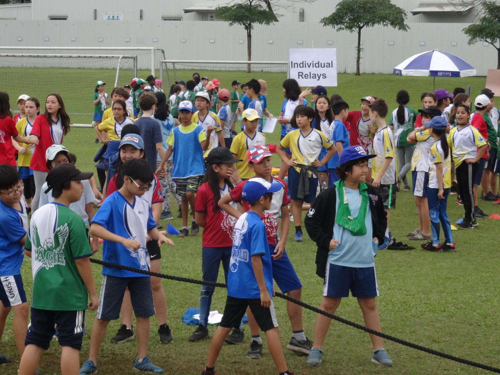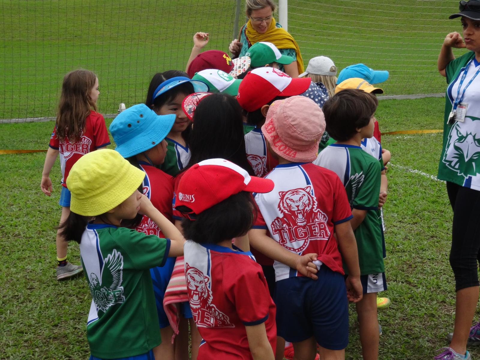 Das Sportfest der UNIS fand während der Woche an einem Schultag statt. Das ist eine sehr lustige und laute Angelegenheit. Musik wird sowieso bei jedem Anlass in ordentlicher Lautstärke gespielt. Jedes Kind ist vom Schulstart an einer Gruppe zugeordnet, die nicht der eigenen Klasse entspricht, so dass sich übergeordnete Gruppierungen ergeben. Felix ist Tiger, es gibt aber u.a. auch Eagle und Dragon. Schüler der Gruppen gehen auf dem Sportgelände von Aktivität zu Aktivität. Es zählt in keinem Fall ein Einzelsieg, sondern immer nur das Gruppenergebnis. Jeweils 2 Gruppen treten gegeneinander an.