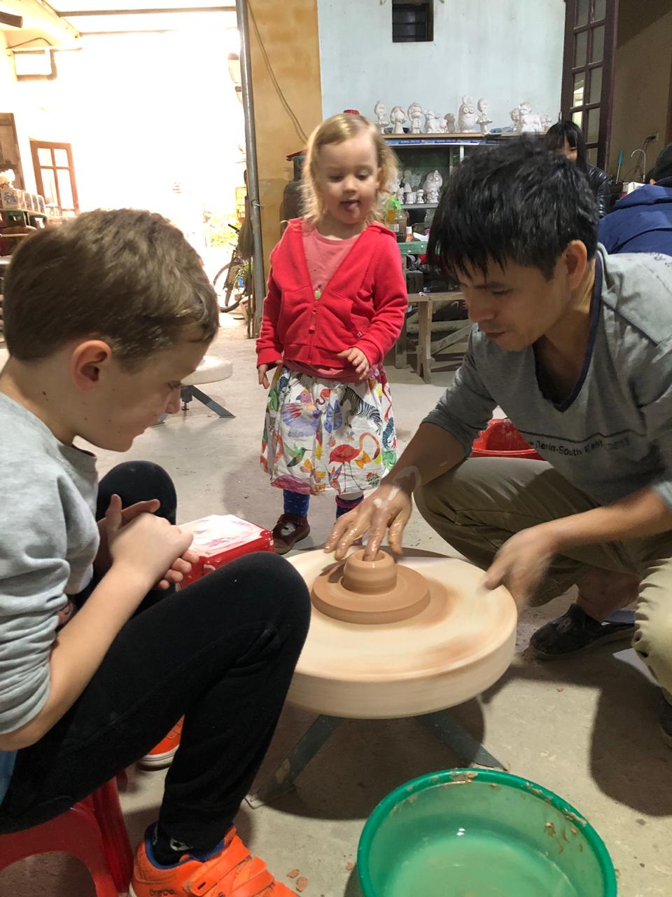 Wer mag, kann auch selber etwas töpfern. Felix hatte sehr viel Freude daran. Das Ergebnis wurde sofort gebrannt und er konnte den Becher mitnehmen. Lea hat derweil kleine Figuren angemalt, Anna und Rainer haben ihren Geschirrbestand erweitert und ich habe mir eine kleine Vase gekauft. Mehr geht leider nicht auf einer Flugreise.